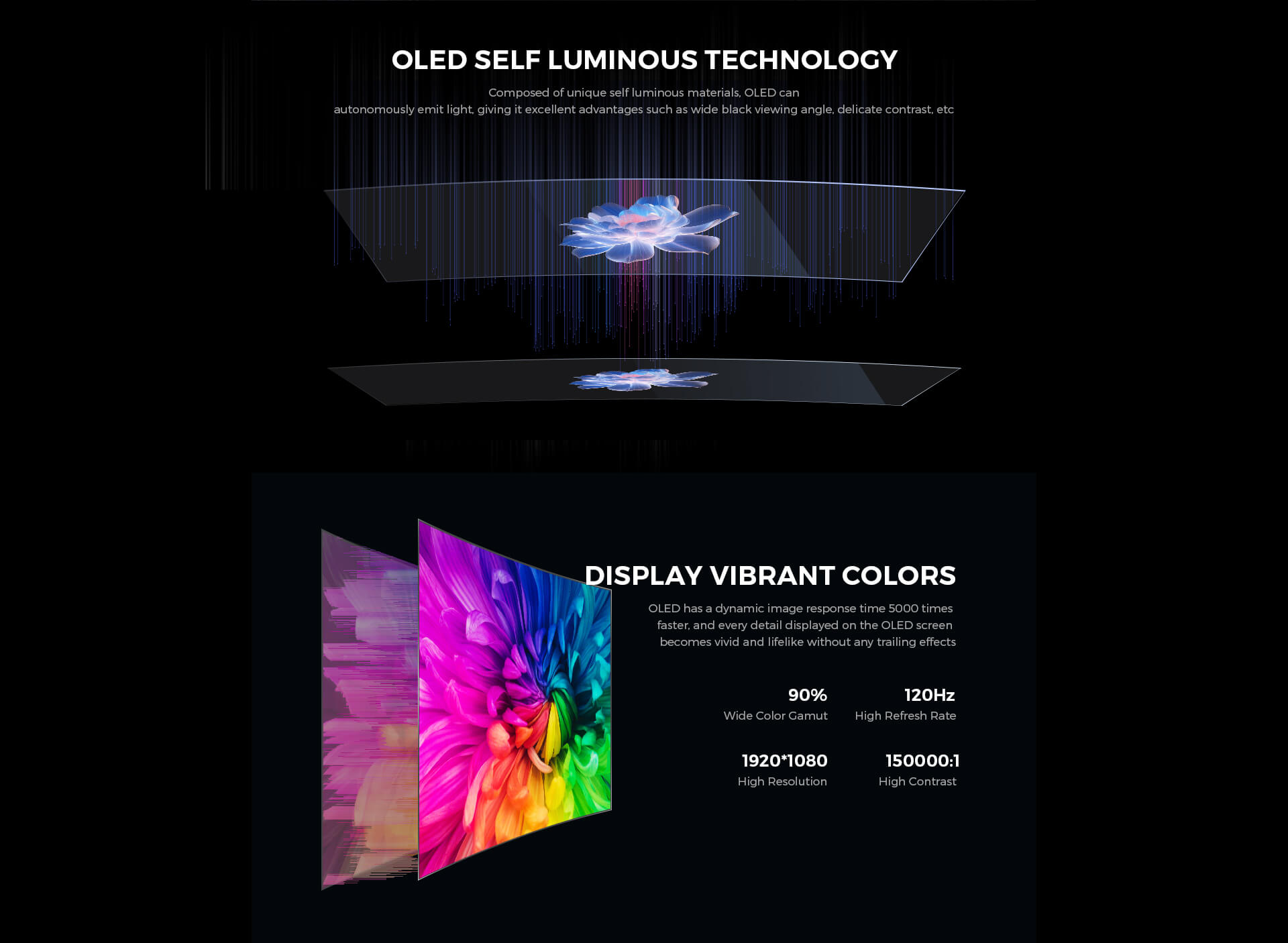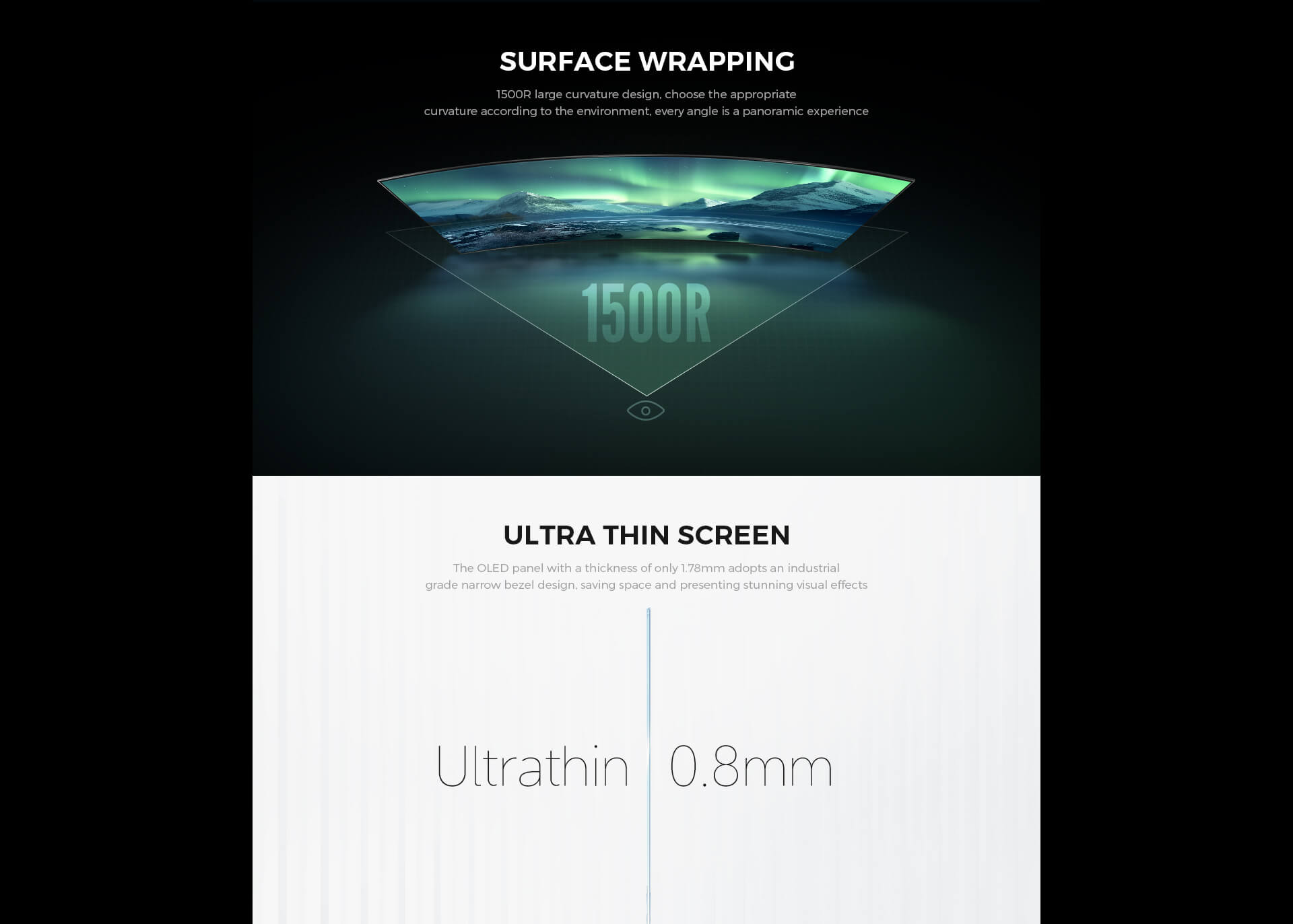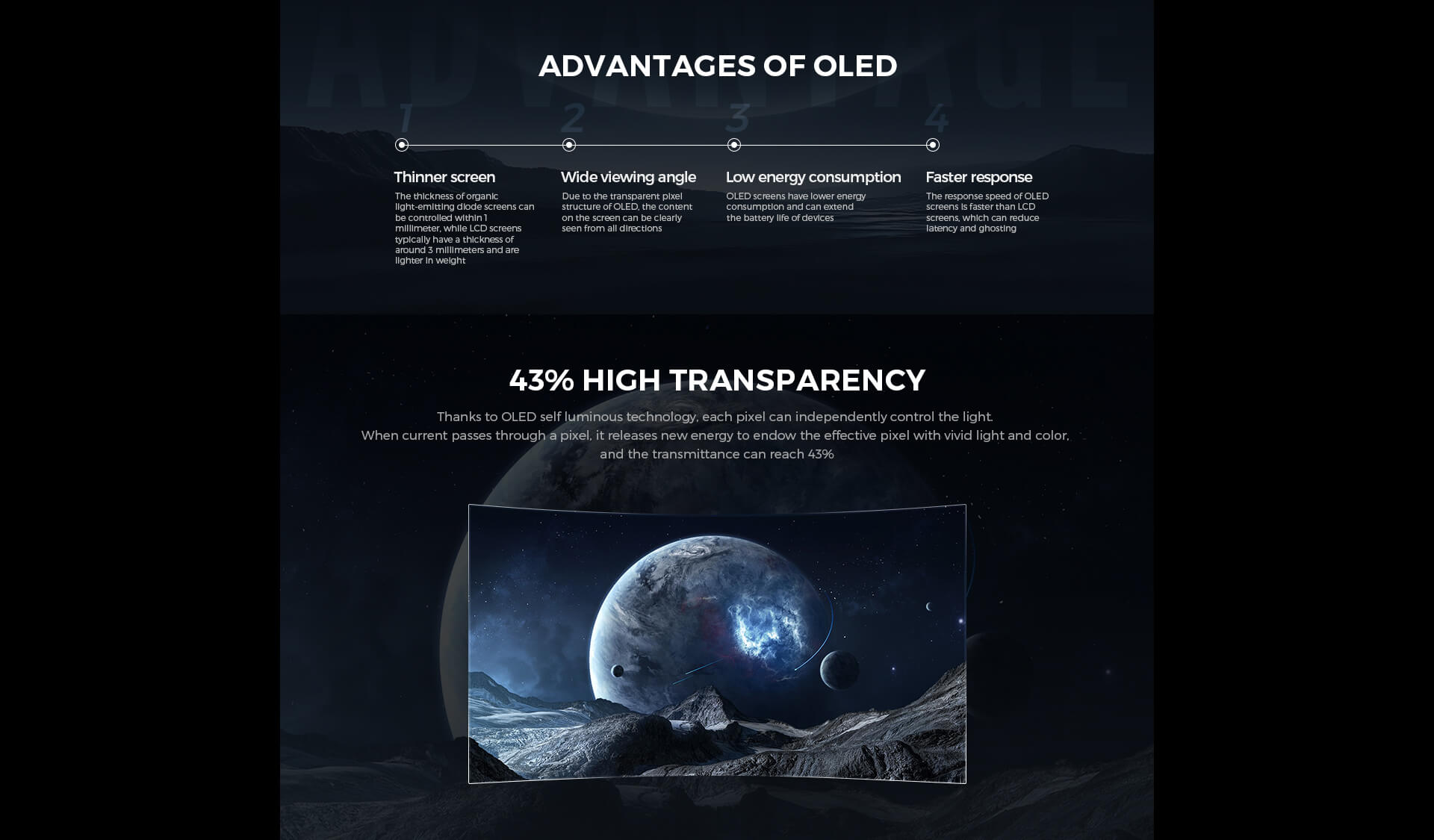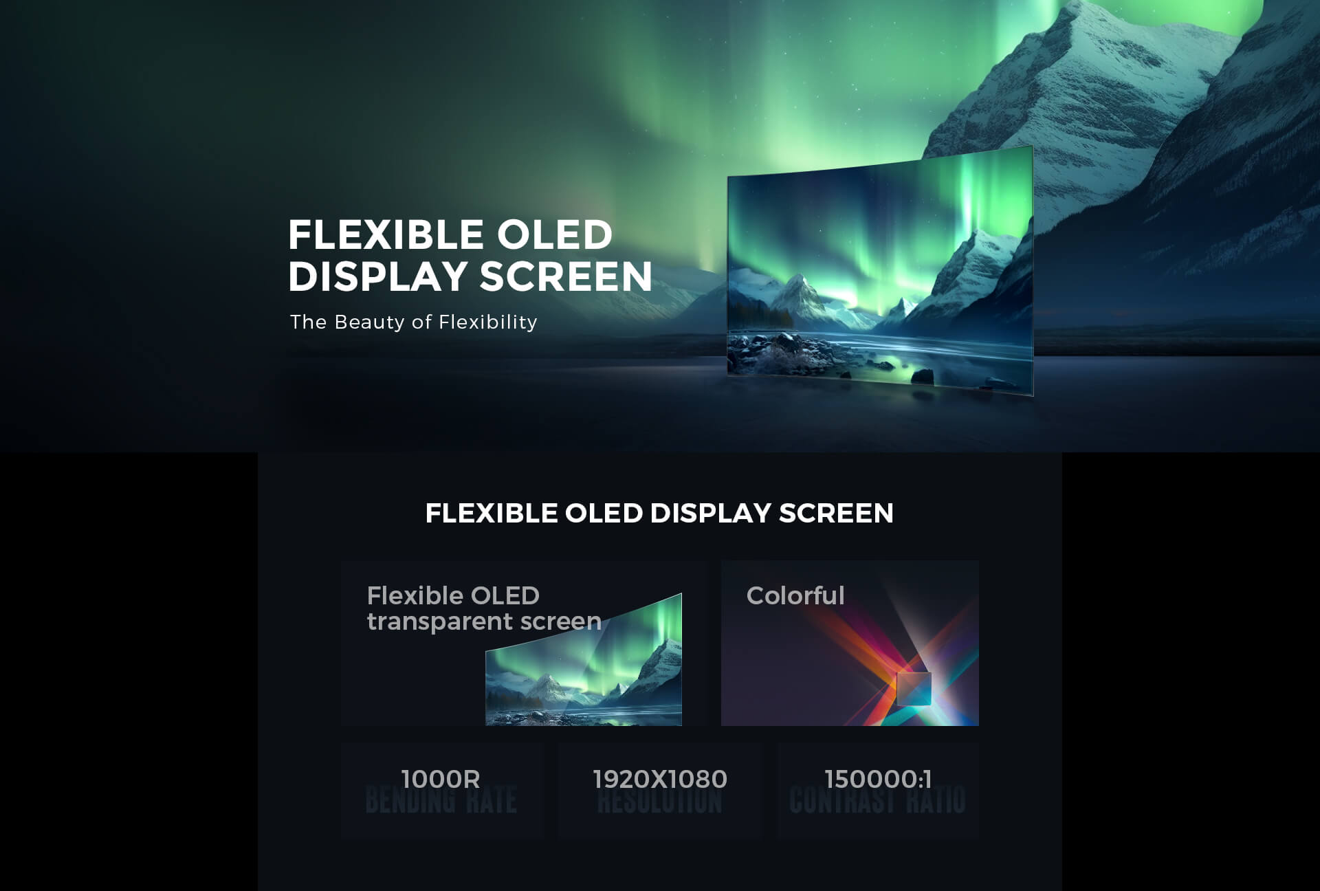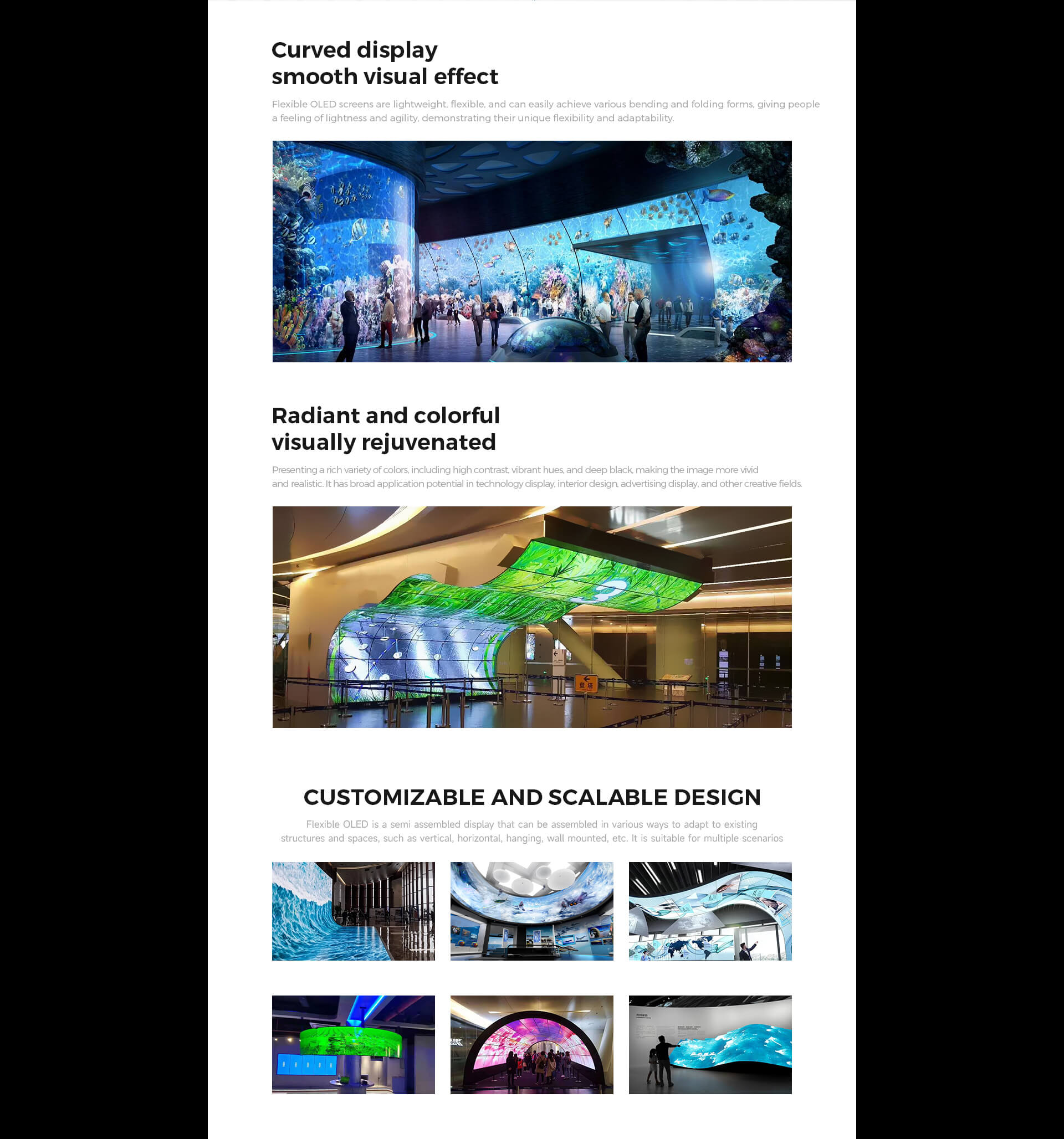 The 55 inch OLED flexible screen adopts a 55 inch flexible OLED screen that can be spliced and installed according to the needs of the scene. It is an emerging display system that is highly sought after by various industries due to its friendly interactive characteristics. It is widely used in various commemorative exhibition halls, museums, cultural exhibition halls, archives, science and technology museums, enterprise exhibition halls, bookstores, tourist exhibition areas, various theme halls, real estate exhibition halls, school history halls, intangible cultural heritage historical and cultural exhibition halls, digital car exhibition halls, digital airport exhibition halls, digital human applications, etc.