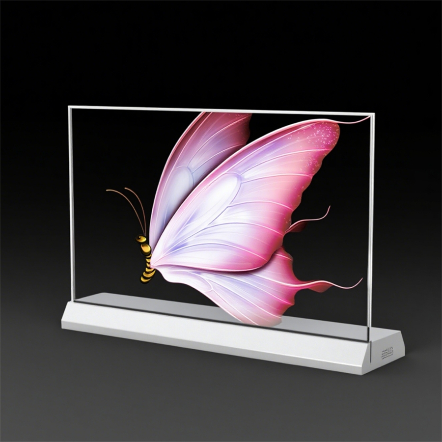 Product category: 55 inch OLED new transparent screen - desktop version Product features: Transparent OLED screens are different from LCD screens in that they have no backlight and can emit light on their own. They have a transparency of 43% and a finer and clearer image quality. High stability: OLED self luminous technology, clearer image quality, transparent and lightweight design, showcasing multiple possibilities, pixel self controlled light, ultra fast response. Customizable: Nexoled technology is advanced and customized according to different application scenarios. The price is reasonable, and we are responsible for installation, debugging, and training. We also offer compensation for broken screens and provide one-stop services.